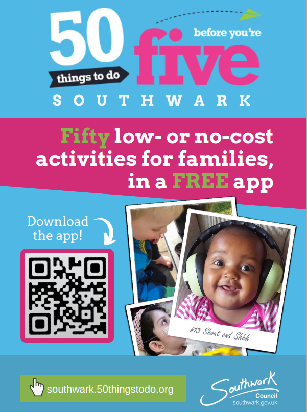 Southwark is the first London borough to join the 50 Things To Do Before You’re 5, an exciting app which provides an amazing menu of exciting activities in Southwark for families with young children. 50 Things To Do Before You’re 5 gives great suggestions for how to have fun and learn at the same time in one handy app, and includes activities from Southwark Family and Children Centres such as 1st Place.