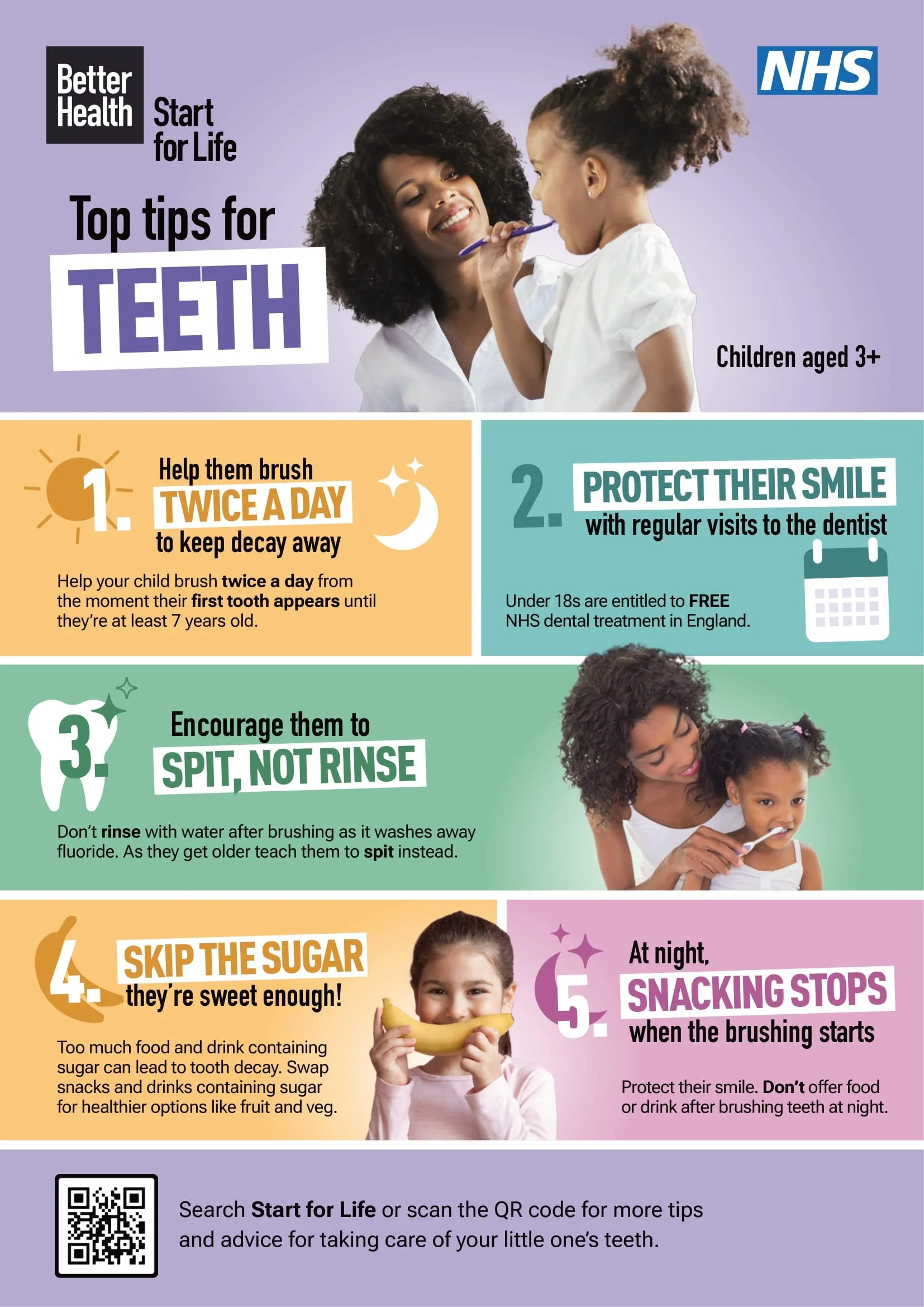 Looking after your baby or toddler’s teeth is an important part of their daily routine even before their first tooth appears! From around 6 months, when teeth start to come through, use a soft baby toothbrush and a smear of fluoride toothpaste. Brush twice a day, especially before bed.