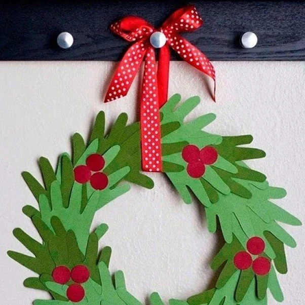 Have fun making lots of templates of your child’s hand on green card or paper, then let them get sticking. Add a few well-placed red dots and hey presto, you have an incredible wreath.
