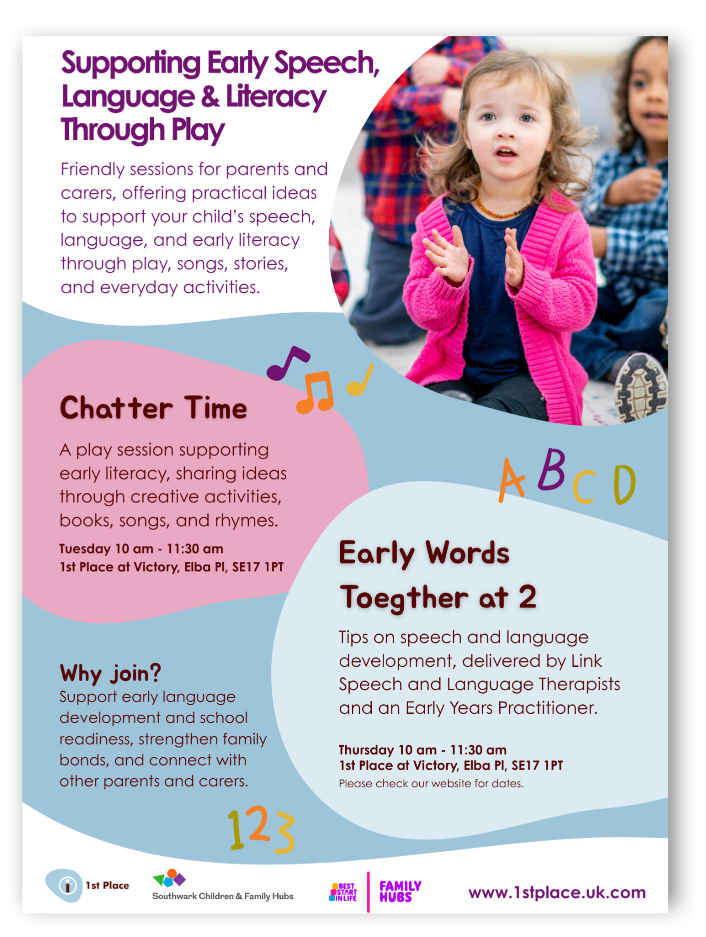 "Early Words Together really helped me, I learned new ways to support my child’s speech and play and we loved the songs and activities. My daughters speech and confidence has come on so much!" - Southwark parent