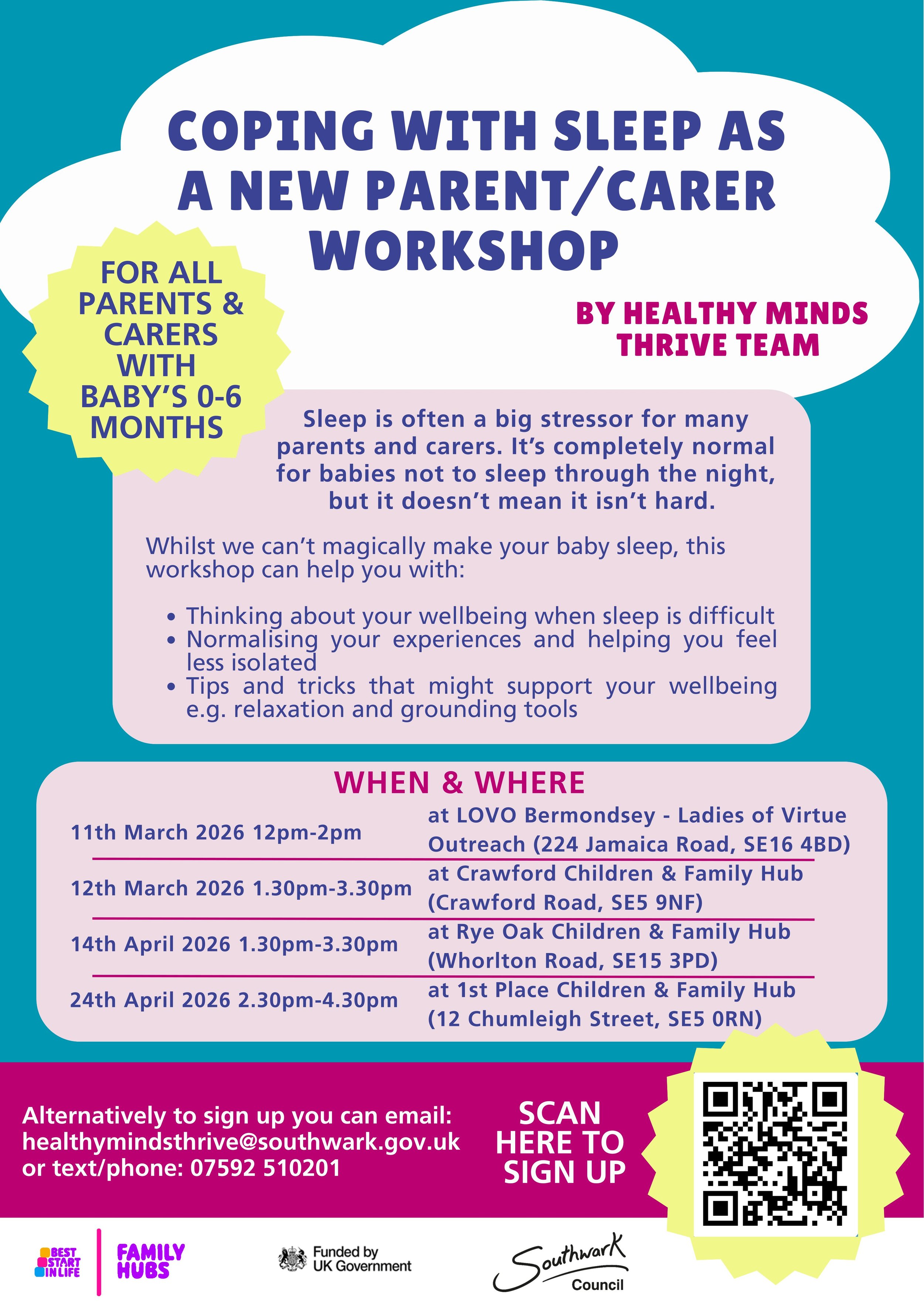 The Coping with Sleep as a New Parent/Carer workshop has been created to offer reassurance, understanding, and practical emotional support during the early months. Designed for parents and carers of babies aged 0–6 months, the sessions focus on wellbeing, normalising experiences, and sharing gentle techniques that may help when sleep feels overwhelming.
